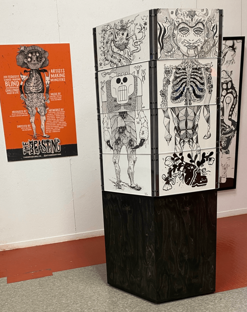 The Beasting is an exquisite corpse-making challenge featuring blind collaborations by artists of many styles, ages, experiences & backgrounds. Two dozen artists are invited to create one of four beastly body parts at 44 Gaukel using limited time, materials & instructions. The awesome result features time lapse videos of 24 artists’ pieces & some fabulous full-beast combos, plus an incredible interactive display called The Beastagon (scroll down to see it).