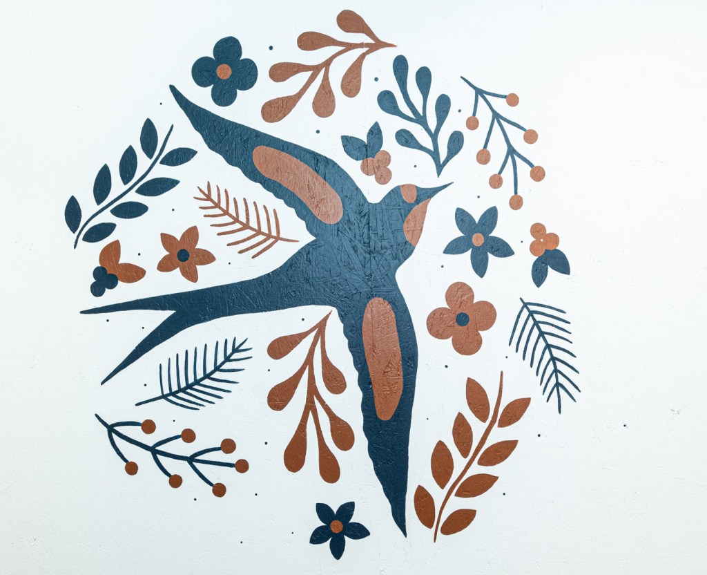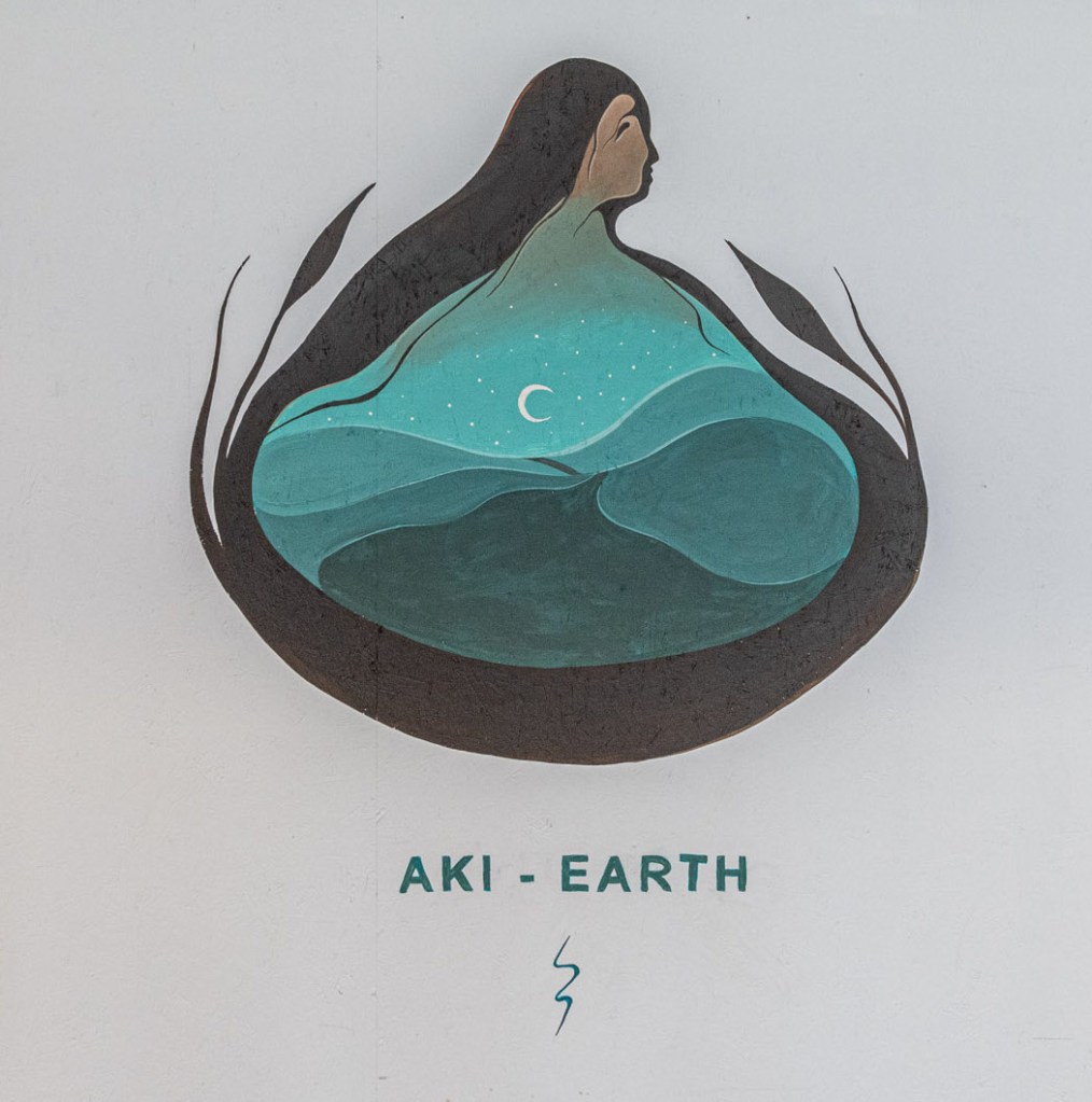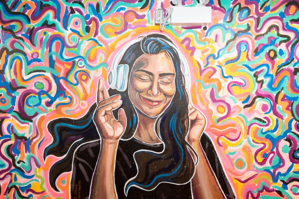 Originally created for a T-shirt collaboration with Good Company Productions, Alanah later proposed making a wall-sized version. “At the heart of music is our connection to the land,” Alanah explains. “With each beat of the drum, we are reminded of our First Mother’s heartbeat: its strength, its power & its unconditional love. Music is a way to feed our spirits & the music that surrounds us has been alive forever: you just need to listen.”