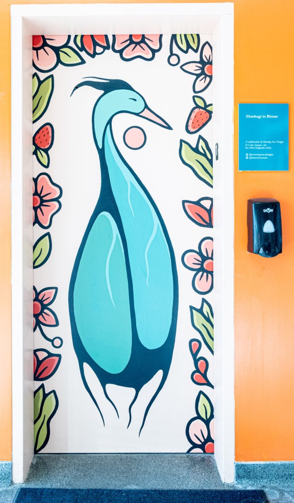 Herons, or zhashagis in Anishinaabemowin, are a recurring subject in Luke’s work. He collaborated with Alanah on this elevator door artwork in spring 2020 & they each painted one of the murals shown below in spring 2021.