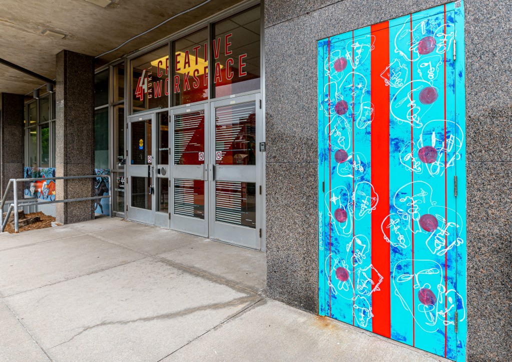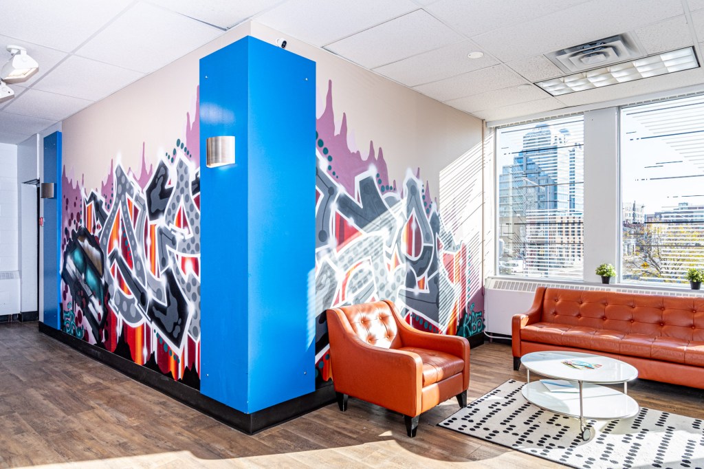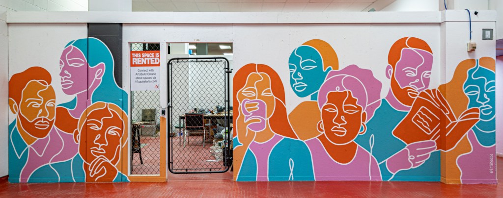 Trisha Abe is a painter & illustrator whose murals grace outdoor & office spaces all over Kitchener-Waterloo, plus she’s an emerging tattoo artist. Her minimalist artwork is heavily influenced by feminine energy & the human form. Familiar Faces celebrates themes of people, diversity & community, using continuous-line faces & an eye-popping complementary palette to energize one of the shared tenant areas on 44 Gaukel’s 1st floor.