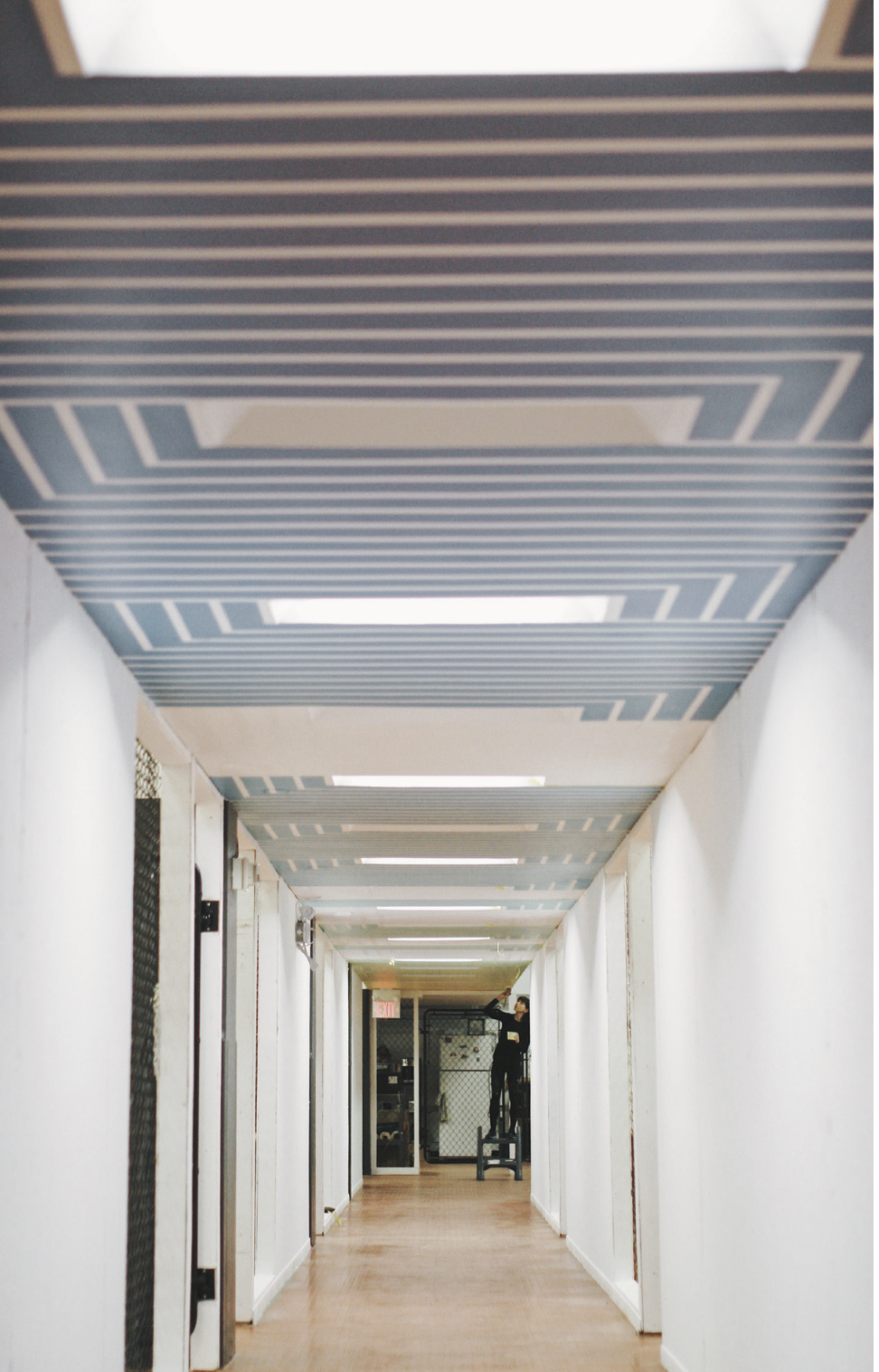 “The corridor which runs the length of the space is a fascinating feature. I wanted to create a design that would evolve as people walked from one end of the corridor to the other. I came up with a simple line graphic which repeats down the hallway, gradually changing colour from light yellow to deep purple.”