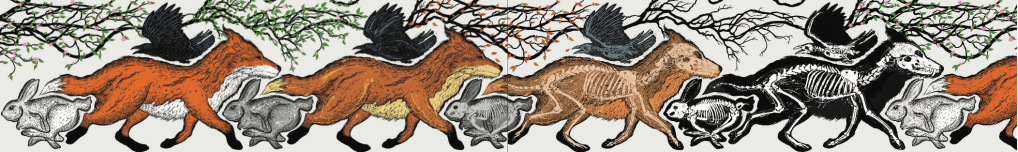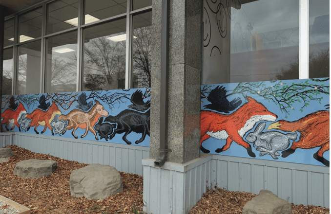 My Pet Skeleton is the creative pseudonym of Juno- & Emmy-award-winning graphic artist Vincent Marcone, who blends digital & physical techniques. Vincent developed this long, cyclical mural for the front façade of 44 Gaukel Creative Workspace to allude to the facility’s many functions, faces & seasons. Students, entrepreneurs, scientists & artists have all used this space, but the constant that binds their experiences here is a spirit of creation. Three animals, native to the area, were chosen to symbolize the successful ingredients that live within 44G. Each animal flourishes, ages, dies & is born again to illustrate the many roles of this transformative space.